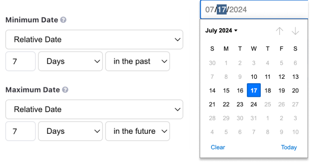 - Relative Date - A date relative to when the participant is filling out the survey. For example, if you choose "7 days in the past" for "Minimum Date" and "7 days in the future" for "Maximum Date," the participant won't be able to choose dates more than a week ago or a week from when they take the survey.