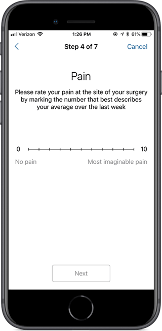 The scale answer format displays a scale to the participant for them to select a value in a range. For instance, it is useful to assess things like pain scores, instead of having to present a text choice to the participant. You can also use this answer format to create a Likert Scale, selecting the minimum and maximum values, as well as the number of steps between the minimum and maximum values, as pictured below.
