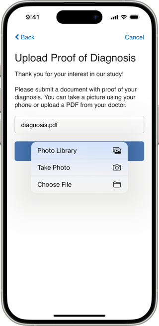 The file upload answer format allows participants to submit a range of file types, from PDFs to videos. For example, users can a diagnostic document, a voice or video diary, or an image of their incision site.