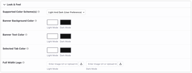 • Look & Feel: This section allows you to control the look and feel of the app layout, including the option to add full width logos.