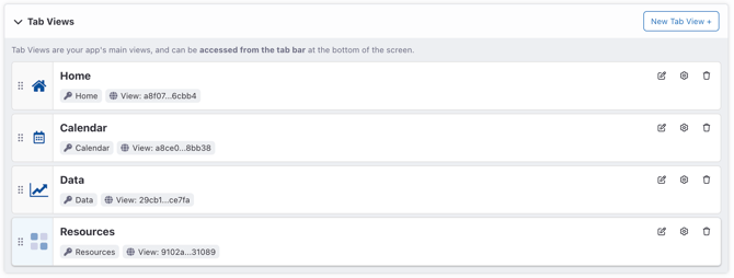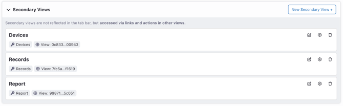 • Secondary Views: This section is where you will create and manage your Secondary Views, which are the views that can be launched by the Action or Button components in your Tab Views. Think