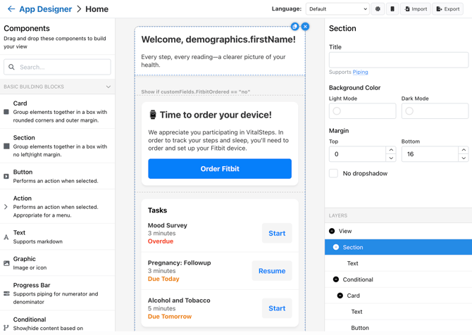 The App Designer is where you create and manage your participant app experience. This allows you to control the arrangement of content displayed to participants, tailoring it to fit your project's needs. Create survey task lists & call-to-action cards, return device data & health records, provide resources, and much more.
