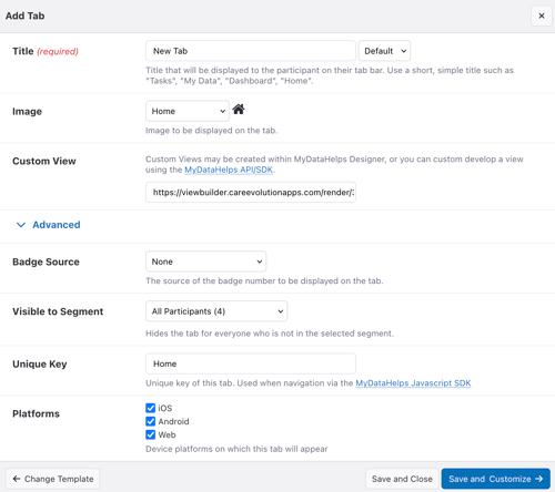 Tab View Details include Title, Image, Badge Source, Visible to Segment, Unique Key, & Platforms: