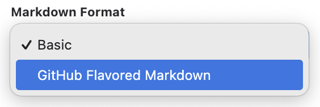- Markdown Format, either basic or GitHub Flavored Markdown, to visually enhance your survey. This setting is only available for the Standard Survey V2 survey type (the Standard Survey type only uses basic markdown formatting).