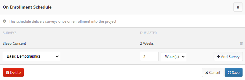 If sending a demographic survey separate from the enrollment survey, you may want to deliver the survey on enrollment. Create a survey schedule that sends your demographic survey with the "on enrollment" trigger. For more information, see Creating Schedules to Deliver Project Content.