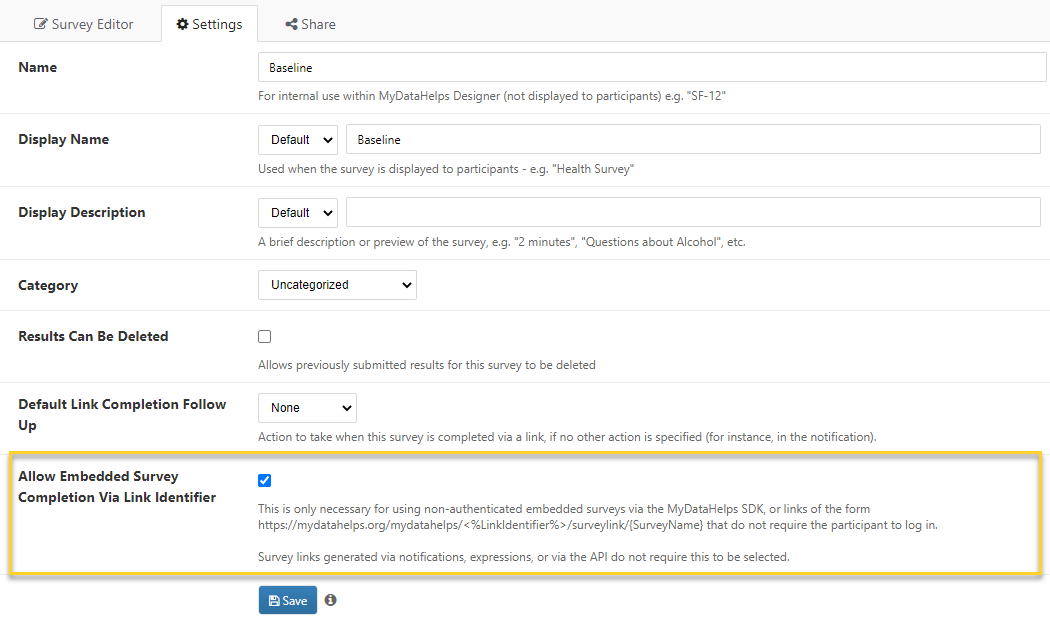 To enable survey completion via link for projects using this legacy link type, “Allow Embedded Survey Completion Via Link Identifier” must be selected within the survey settings.