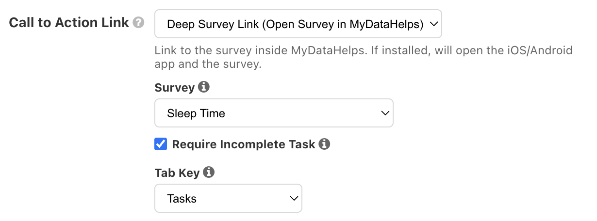 - Tab Key: The tab that the participant will be directed to within the app. Home and Tasks are commonly used Tab Key options.