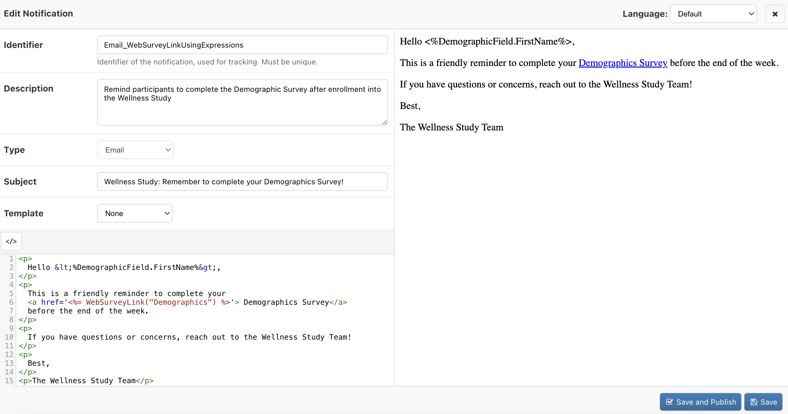 For example, to create an email notification using the Project Invitation email template that directs new participants to complete the Wellness Study consent survey via web and to register an account with the MyDataHelps app: