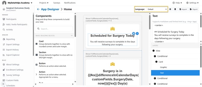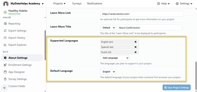If your project plans to enroll participants whose primary language is not English, you can configure your project’s content (including names & descriptions, surveys, notifications, and app tabs & views) to display in additional languages.