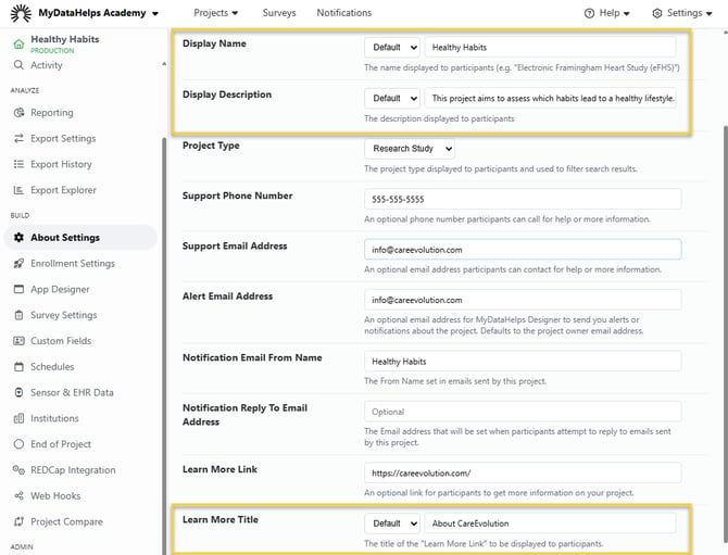 Additionally, within the project's About Settings, you can use the "Default" dropdown to add translations for Display Name, Display Description, and Learn More Title.