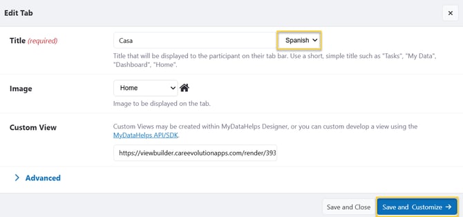 If your project utilizes the participant-facing MyDataHelps app, start by adding the translated Title of each tab within the app by going to App Designer, clicking on the tab to edit, then updating the Title field. From there, click Save and Customize to add translations to the view.