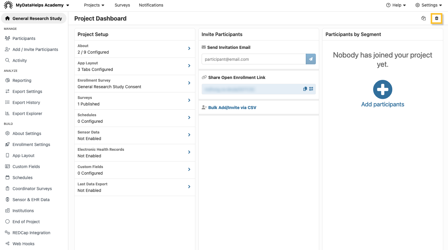 You may find the need to copy and delete projects as you test your MyDataHelps projects.