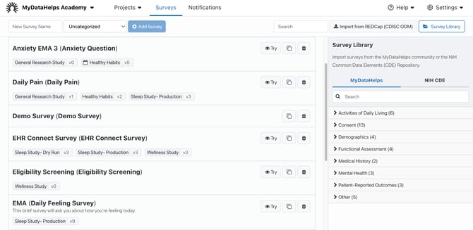 For simple surveys, the "Try It Out" button will let you test your survey without collecting any data. You can also click on the eye icon to try out your survey from a particular step. See Testing Projects and Surveys for more advanced testing options.