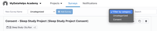 Surveys can be categorized in the Survey Tab and within the Survey Properties. Categorizing surveys allows you to easily filter your surveys by group rather than searching through all of your project’s surveys.