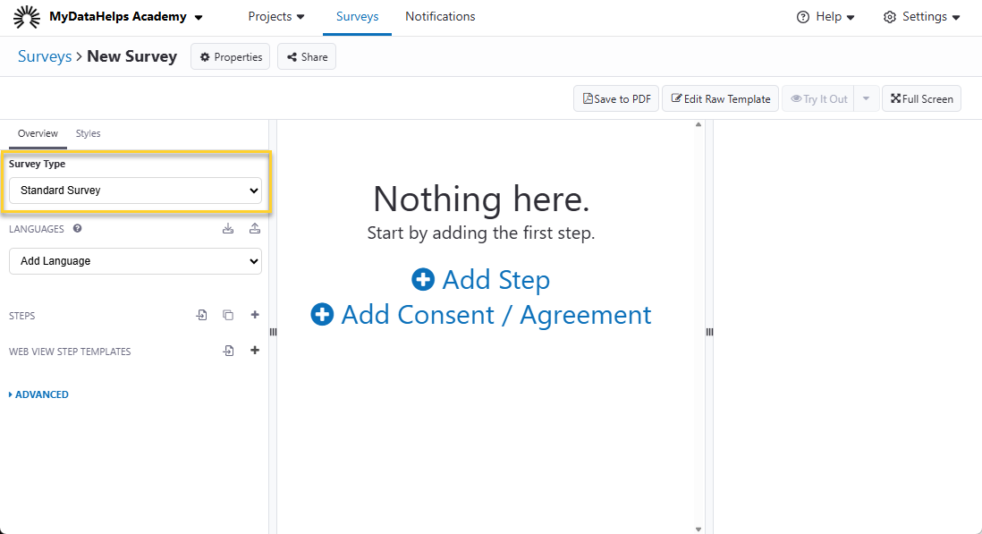 If you are creating a standard survey, begin by clicking “Add Step” to add a step to your survey. Select “Step Type” on the right to select from question steps, instruction steps, consent steps, and more.