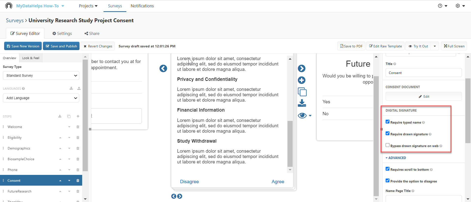 - Require drawn signature: If enabled, participants will be required to electronically sign the consent by drawing their signature on their device.