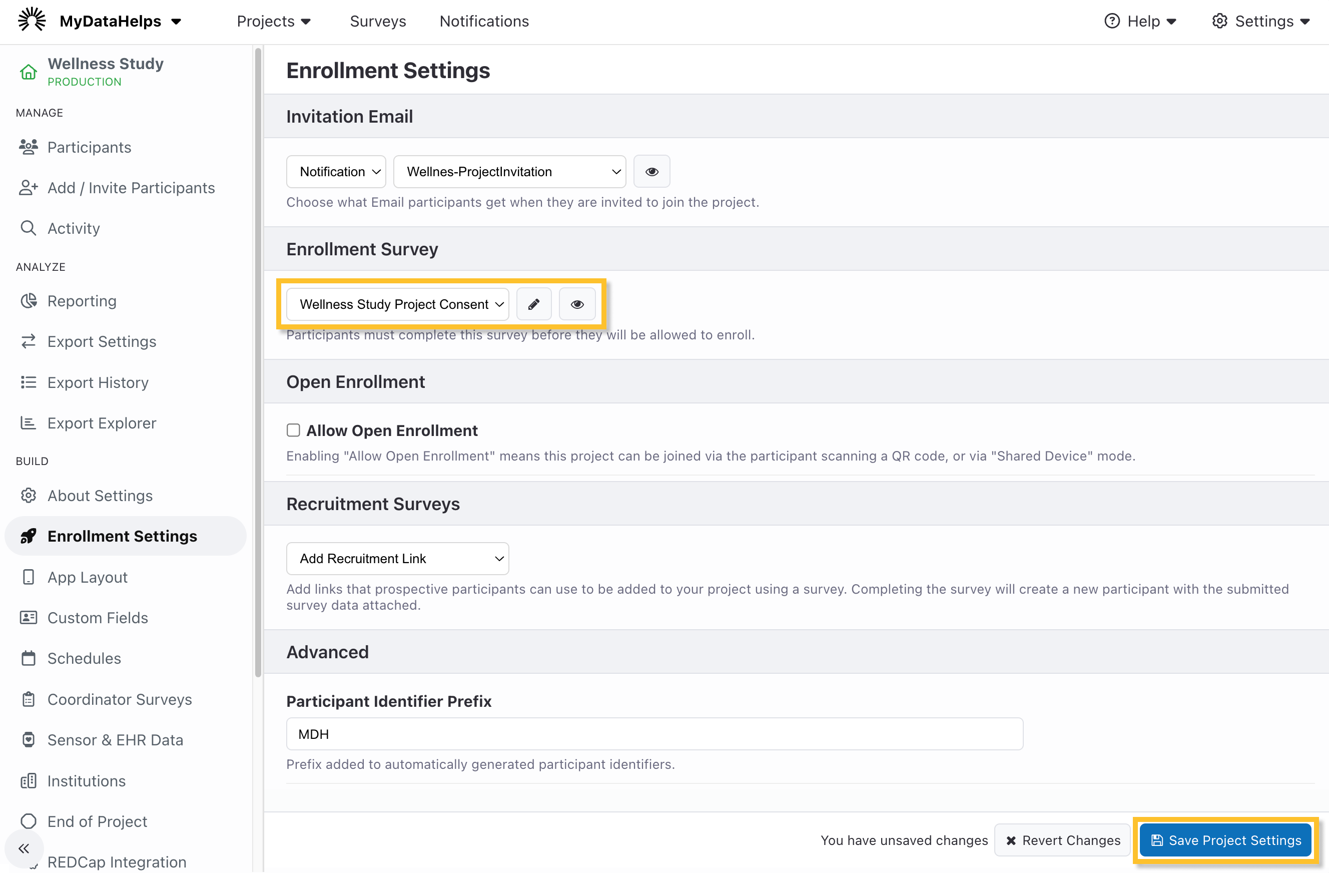 Finally, once you have published your consent survey, navigate to the Enrollment tab of the project settings screen and select it as your enrollment survey if desired. Click Save at the bottom of the settings page to save your changes.