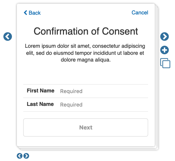 By default, Welcome and Consent steps will be added to your consent. You might consider adding other steps as needed. For example, you may add an instruction step or an eligibility question step with validation rules to prevent a participant from joining your project unless they state that they meet the necessary criteria. While you may have many Step Types in your consent survey, the rest of this article will focus on the Consent Step Type, but you may also want to consider the Consent Form Step Type if you need multiple signatures or questions captured as part of consent.