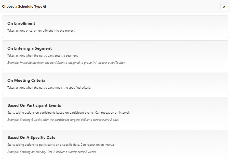 To create your first schedule, click "Add a Schedule" in the middle of the page. If your project already has existing schedules, click "Add Schedule" in the upper right corner. You will be prompted to select a schedule type. Schedules can be set to trigger on enrollment, on entering a segment, on meeting criteria, based on participant events, or on a specific date.