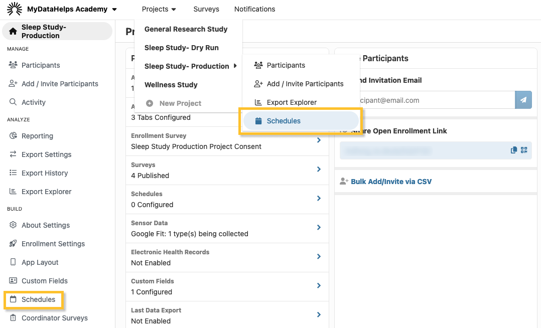 To get started, navigate to your project’s "Schedules" tab, either by clicking Schedules tab or by hovering over Projects on the top navigation bar, then clicking Schedules.