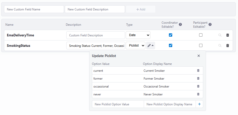 After selecting Picklist, you'll have a row added below to add a picklist option. The option value is the value coded if that option is selected for a participant, while the option display name is the user-friendly name for the option. Once you have your value and display name, click the + icon to add the option. Continue to do this until you have all your values and options. As with all custom fields, you can also choose to make this field Coordinator Editable and/or Participant Editable. Once you have added all options and selected your settings, click Save Custom Field Settings.