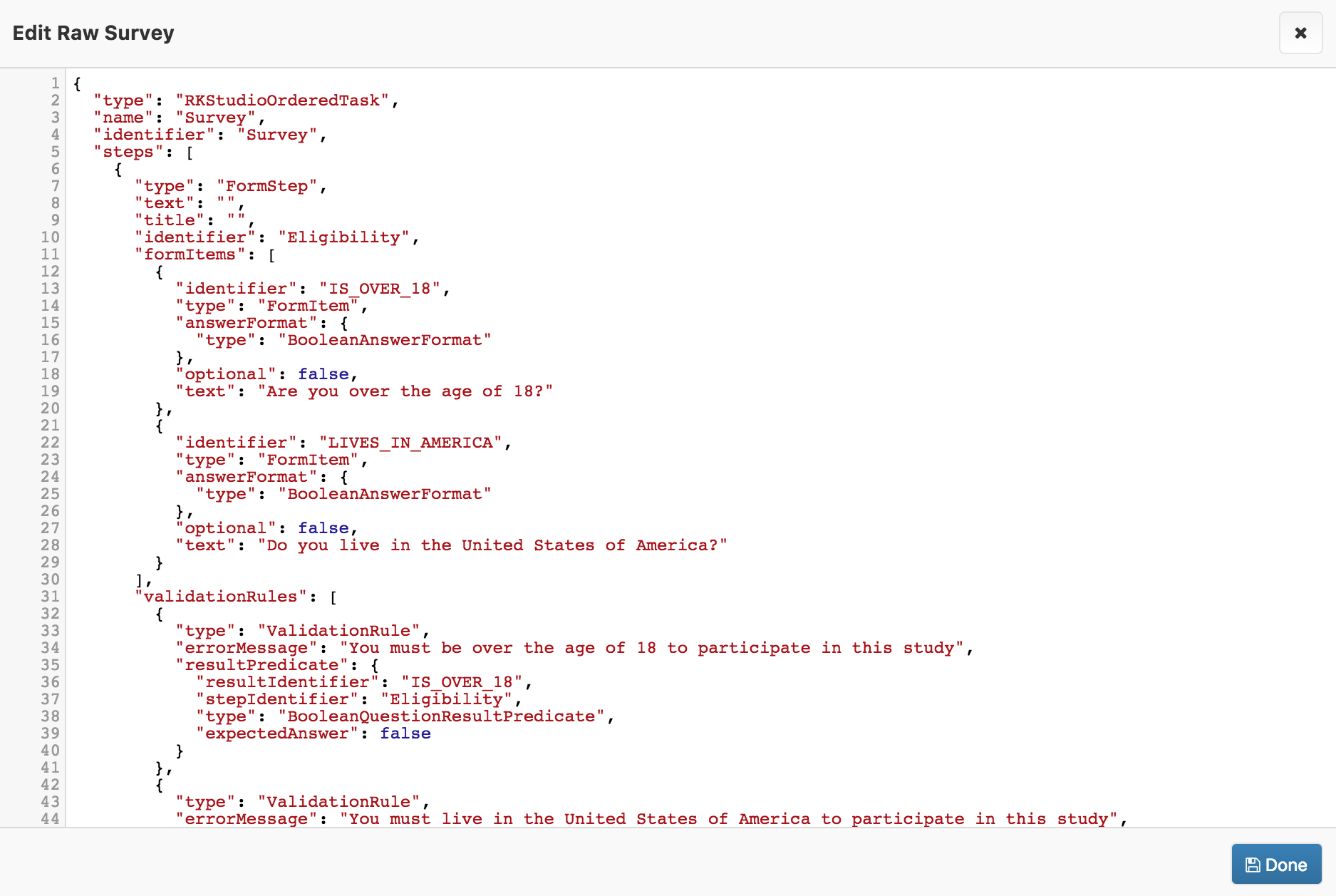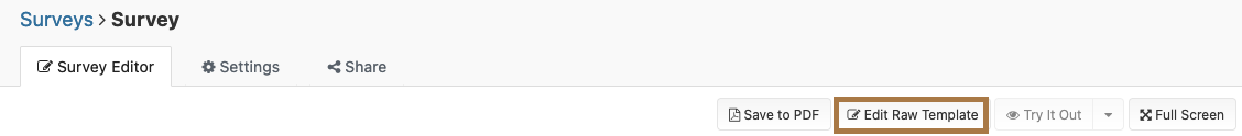When editing a survey, you can click the “Edit Raw Template” button to view the actual JSON for the survey.