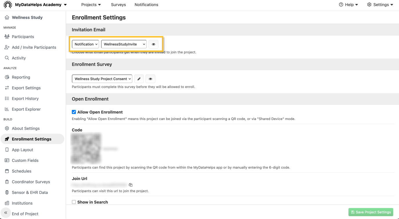 For new projects, the default invitation email is created using the project invitation email template and is automatically assigned to the project in Enrollment Settings. The selected invitation email notification can be updated using the Invitation Email dropdown.