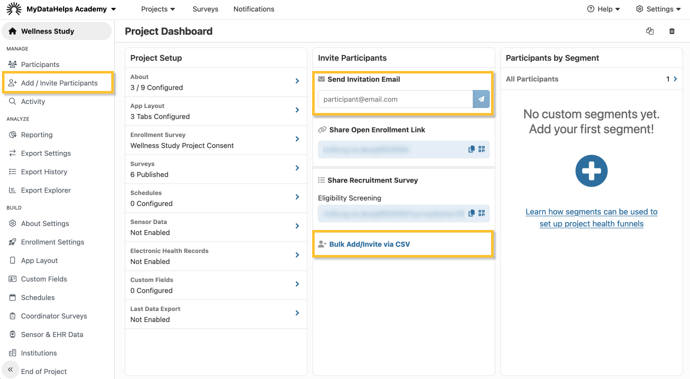 You can either invite participants in bulk or individually. To quickly send an individual invitation, you can use the "Send Invitation Email" field on the project homepage; otherwise, you can bulk invite participants by navigating to the Add/Invite Participants tab.