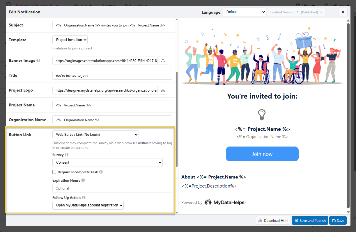 The recommended path to enrollment first consists of completing a survey before account creation. If following this flow, you can either edit the existing "ProjectInvitation" to link to your screening & consent survey followed by account registration, or you could create a new notification from scratch.