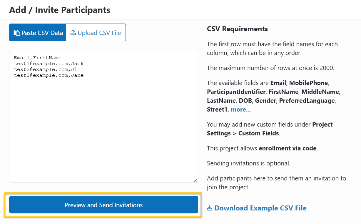 Paste in comma-separated value (CSV) data or upload a CSV file containing the participant data. For an example CSV file with participant data field suggestions, click “Download Example CSV File” at the bottom right hand side of the page.