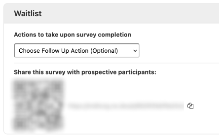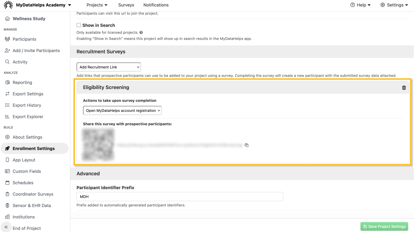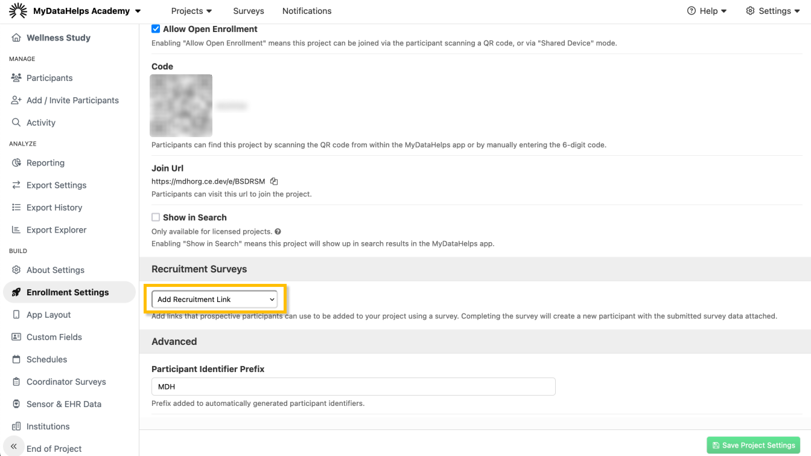 Once you've created the Recruitment Survey Link, you can copy the QR Code or URL directly from the Enrollment Settings or the project homepage.