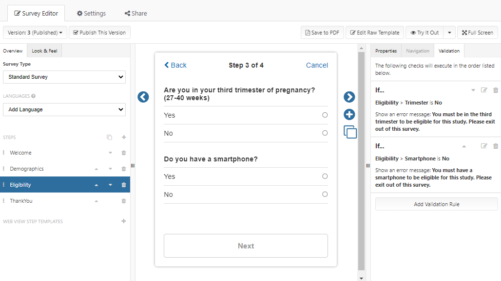 Start by creating your screening & consent survey. If you only wish to gather information of eligible participants, the survey should contain validation logic that prevents the users from completing it if they are not eligible. For example, the Eligibility survey step below, warns a participant that they are not eligible if they answer “No” to either question and advises them to exit the survey.