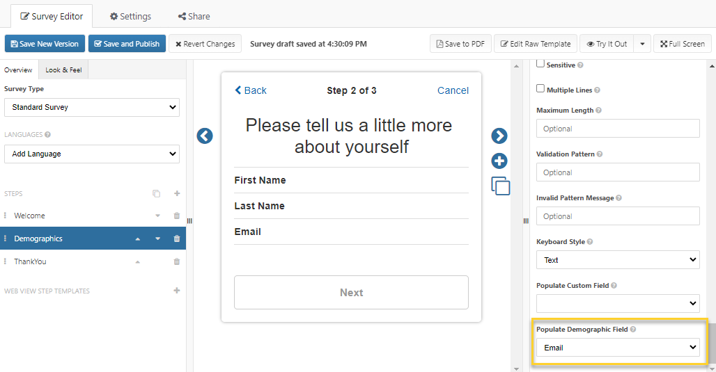 When collecting demographic information via survey, make sure to map the appropriate survey responses to the corresponding demographic fields, such as "Email".