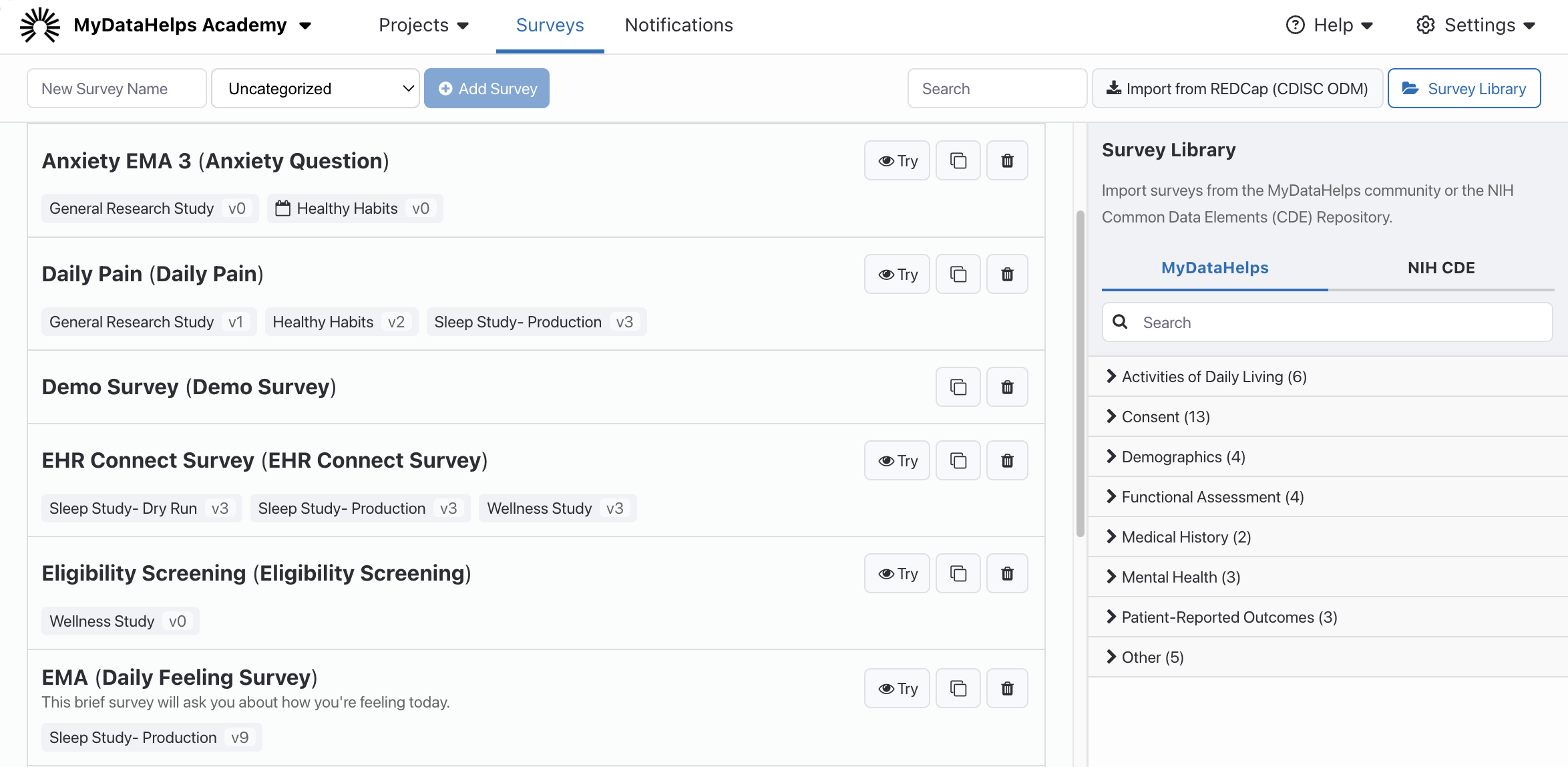 The MyDataHelps Designer Survey Library allows you to import standard surveys that others have created and shared. On the surveys screen, the survey library is displayed on the right side: