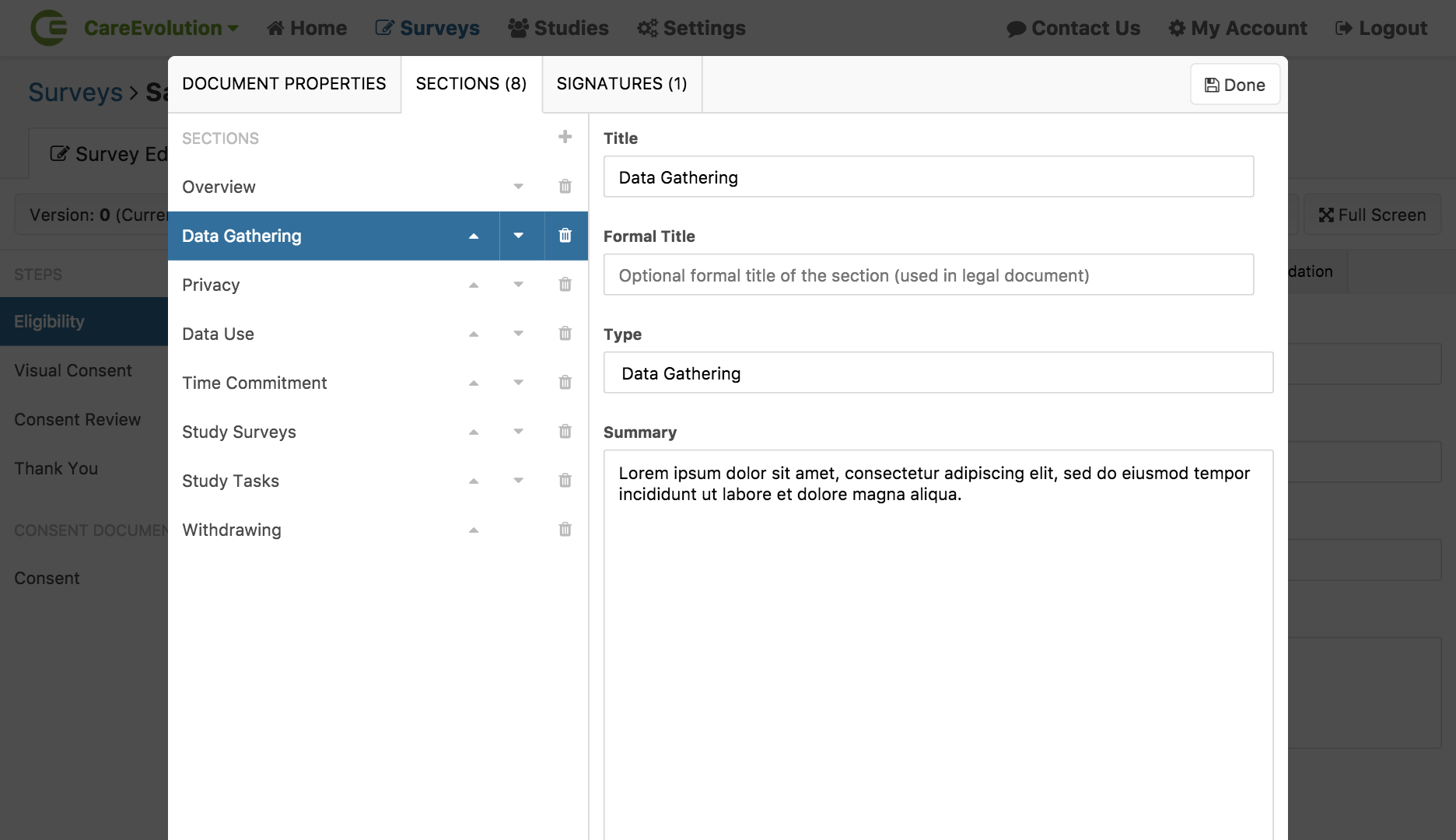 A consent document is made up of various sections, accessible via the “Sections” tab when you are editing a consent document.