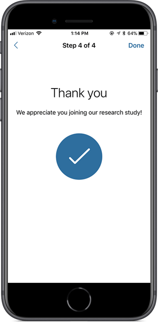 The completion step is simply an instruction step that displays an animated checkmark when the user arrives at this step. It is meant to indicate that the user has completed something, and is frequently used as a “Thank you” step at the end of a survey.