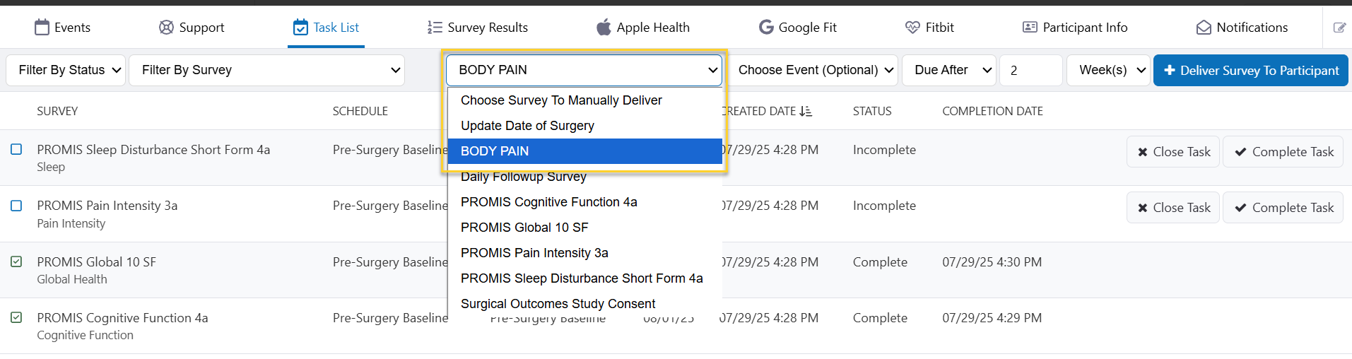 Once delivered, the survey task will appear on the participant's task list just like any other task.