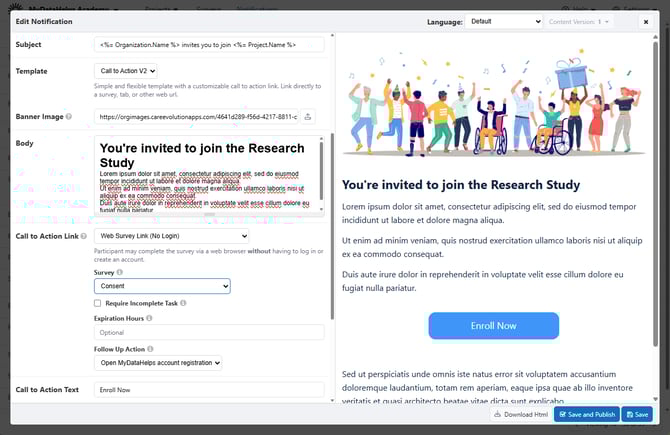 From the template, you can update the banner image, copy and paste your approved participant communications into the Body of the email, and link directly to your screening and/or consent survey (Note: the survey must be published to your project to select it). You can also define a follow up action, such as account registration. More information on sending the invitation can be found in Enrollment by Invitation.