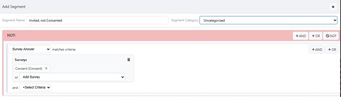 We also advise sending follow up invitation nudges for those who do not enroll, which can be in the form of email or SMS. First, create a segment to look for participants who do not have a survey response for the survey linked in the invitation: