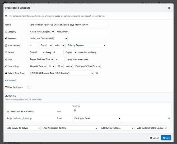From there, you can create a schedule to send a follow up to these participant 2 days after entering the segment, and again 3 days after that, if they've still not consented:
