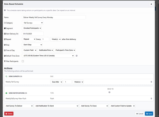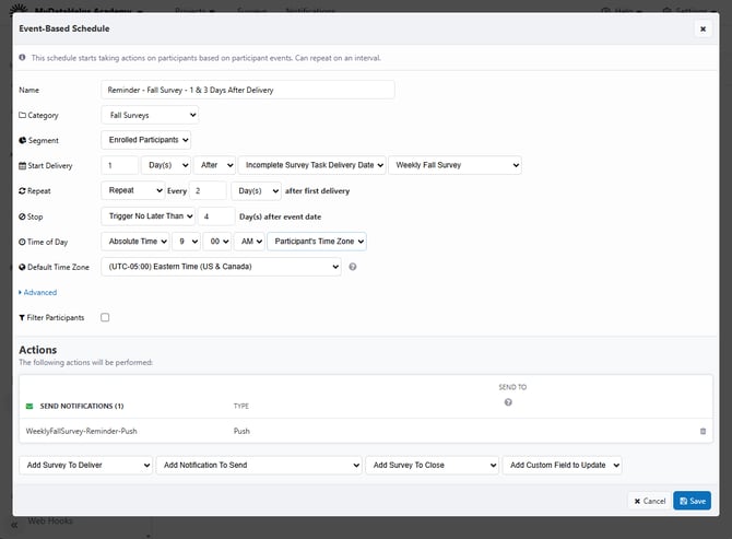 To increase survey compliance, you can also nudge participants to complete survey tasks days later if they remain incomplete. The following schedule will deliver a notification 1 day and 3 days after the Fall survey was delivered, if the Fall survey task is still incomplete: