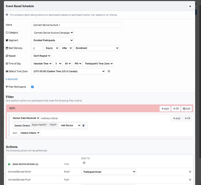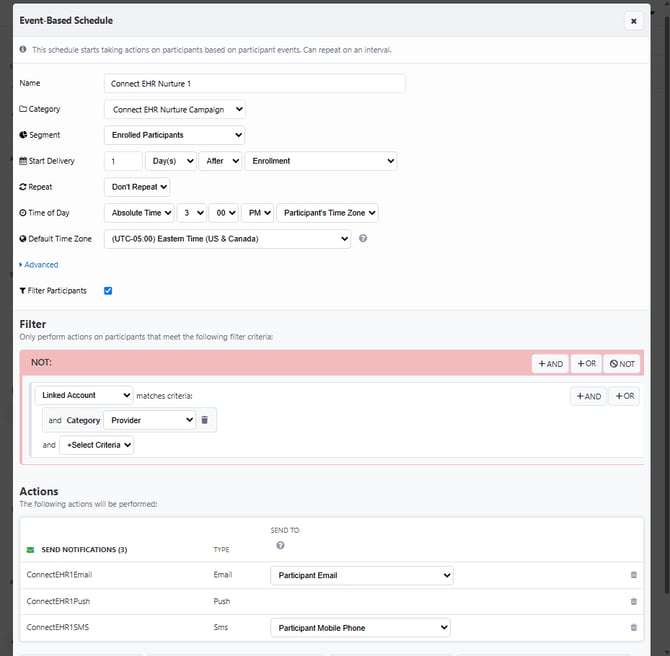 Similar to the previous section, you can nudge participants to connect (or reconnect) their EHR. This can be done using the Linked Account criteria type. The schedule below will notify participants 1 day after enrollment if they have not connected an EHR account:
