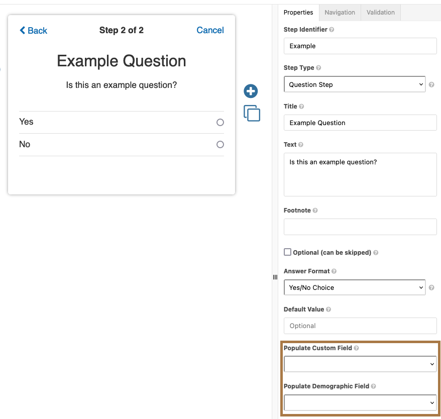 To set a demographic or custom field from a survey answer, find the “Populate Demographic Field” or “Populate Custom Field” option within the right pane on the Step’s Properties tab. Only the following step types can populate a demographic or custom field: