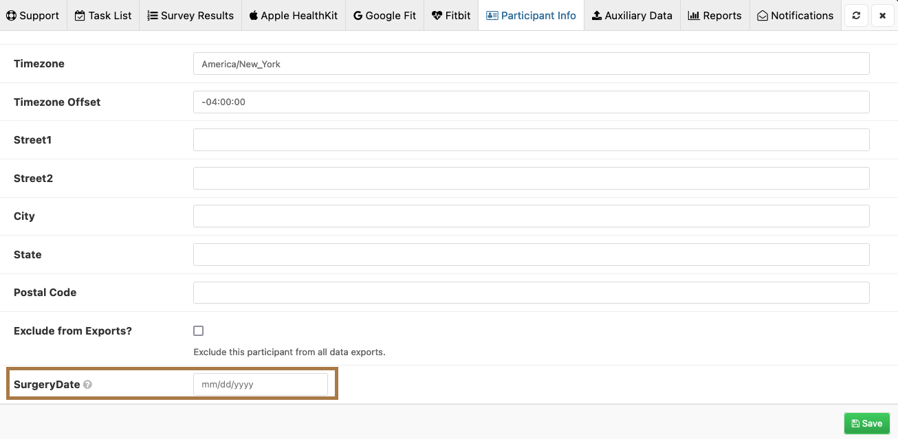 One of the more common ways to populate a demographic or custom field is by saving a participant’s survey answer into the field. For example, a participant could be prompted to provide their diabetes diagnosis date in a survey, populating your DiabetesDiagnosis custom date field.