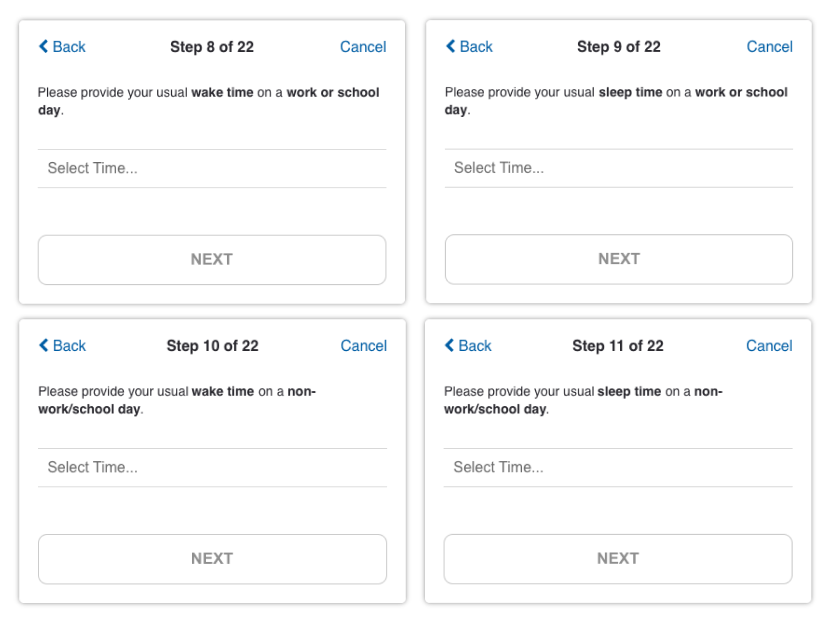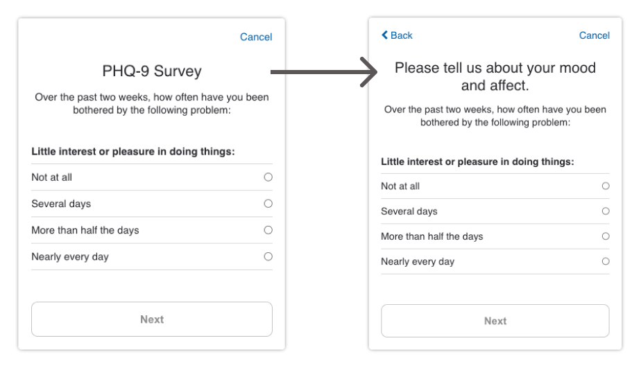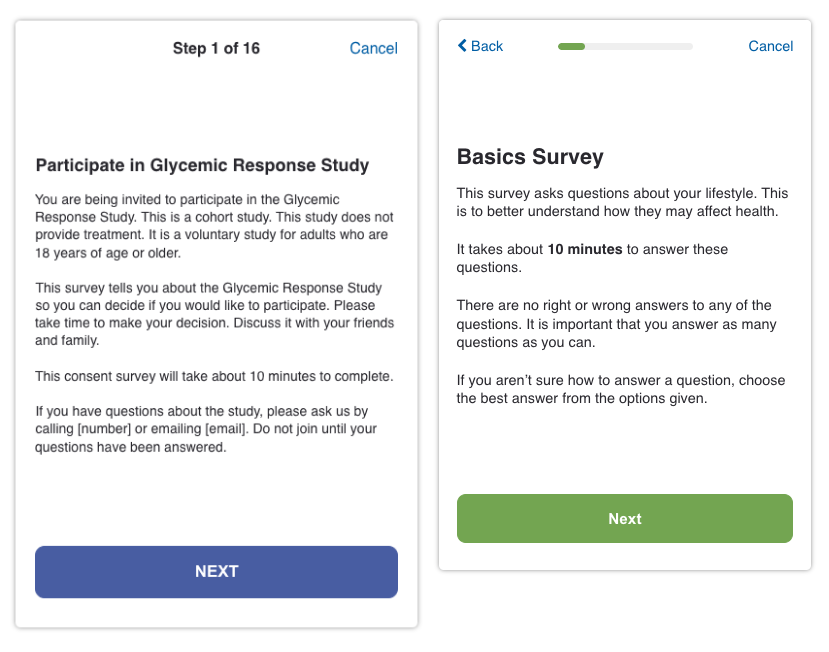 The survey step on the left adds multiple form items within the same step, making it difficult to scroll through. Break them into multiple steps like the survey step on the right so that the participant can feel the forward movement by clicking “Next” instead of scrolling through the step. Form steps should be reserved for short and highly-related questions, such as basic demographics.