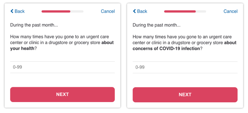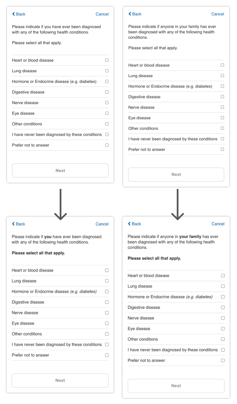 In this example, the keywords “you” and “your family” are bolded to emphasize the changes and differences to be identified across the survey. In addition, examples “(e.g. diabetes)” are italicized to make them stand out.