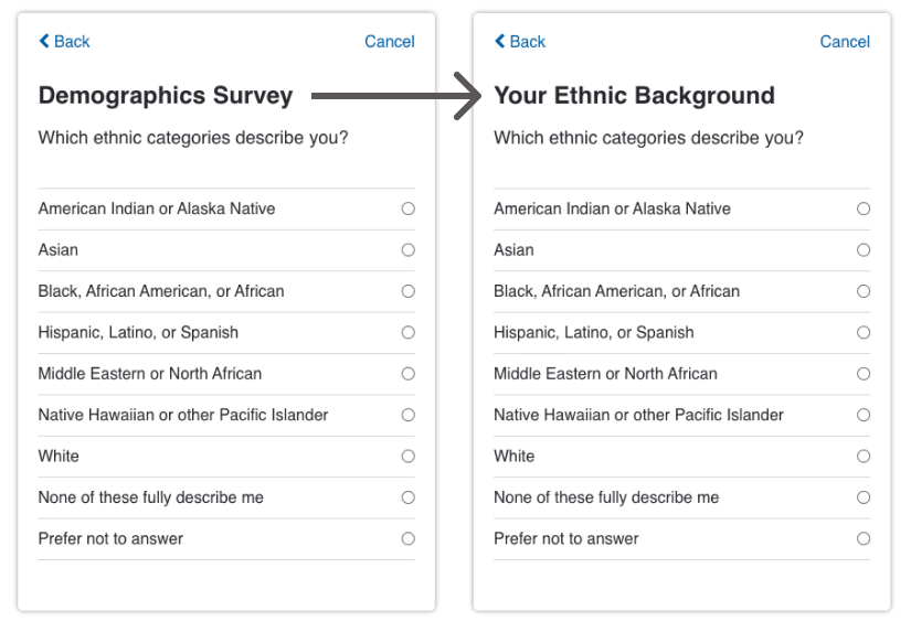 In this example, the title “Demographics Survey” is not necessary, as the title of the survey should be already given to the participants. Instead, choose a title of the step that informs the participants about the specific content of this survey step (e.g., “Your Ethnic Background”).