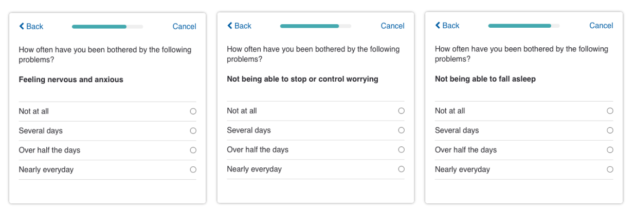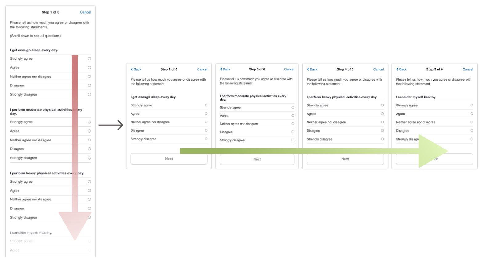 When participants use mobile devices to fill out surveys, vertical scrolling can be tiring and lead to survey fatigue. To minimize this, prioritize horizontal progression by breaking down questions into smaller steps rather than stacking multiple questions in a single vertical layout. With MyDataHelps Designer, you can use single text choice steps instead of listing multiple text choice questions within a single step to reduce vertical scrolling. While this may result in more individual steps, the horizontal progression feels less burdensome and reduces participant fatigue.