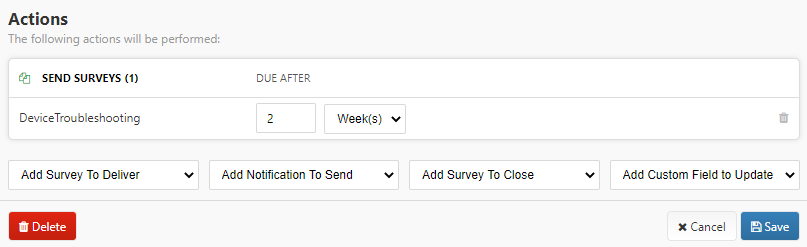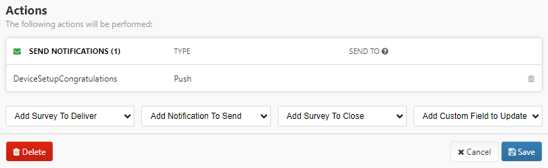 Use the “Add Survey To Deliver” action to deliver a published survey to a participant.