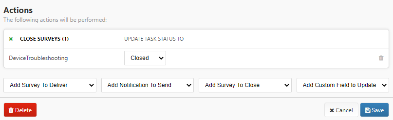 Any survey tasks with status “Complete” or “Closed” at scheduled time will be unaffected by this action. To better understand the different survey statuses, visit the Viewing and Closing Survey Tasks article.